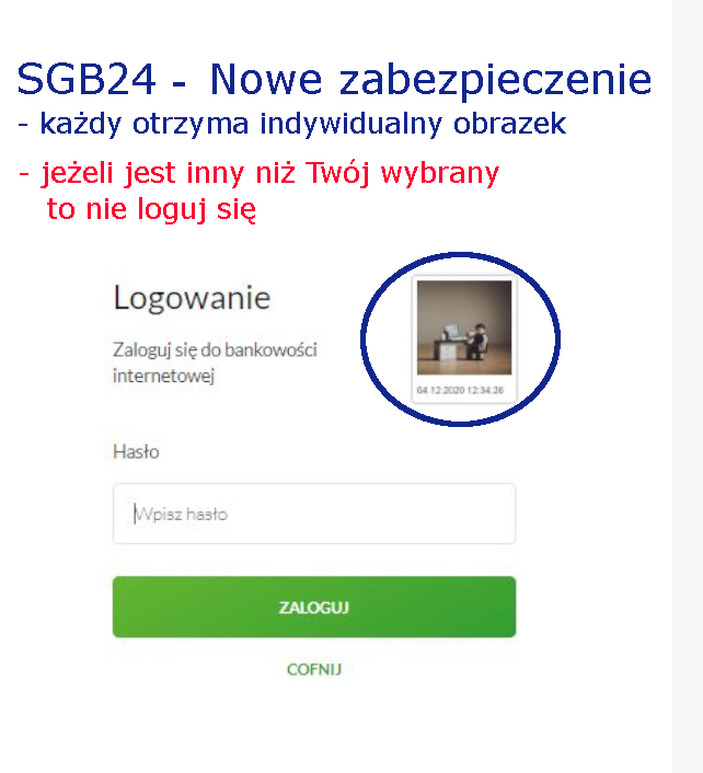 Dzięki temu łatwiej poznasz, czy jesteś na autentycznej stronie logowania do SGB24, czy na podstawionej w celu przechwycenia Twoich poufnych danych. Tzw. obrazek bezpieczeństwa zostanie przypisany do Twojego identyfikatora automatycznie 06 grudnia 2020 r.