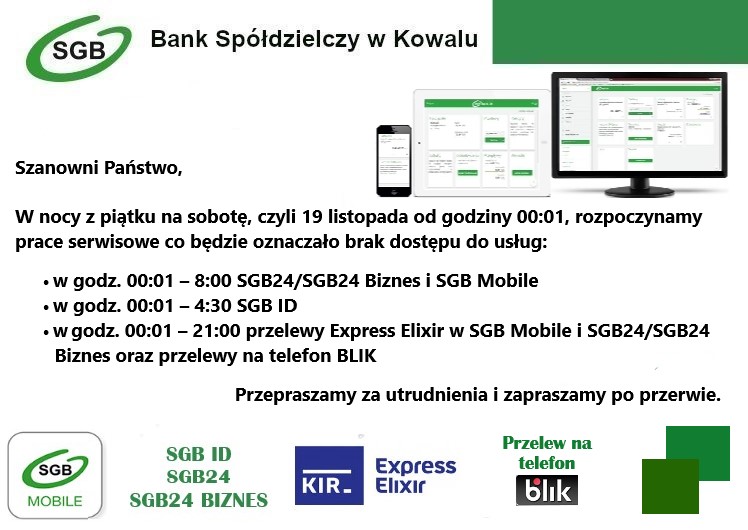 • w godz. 00:01 – 21:00 przelewy Express ElixirSGB MobileSGB24/SGB24 Biznes oraz przelewy na telefon BLIK