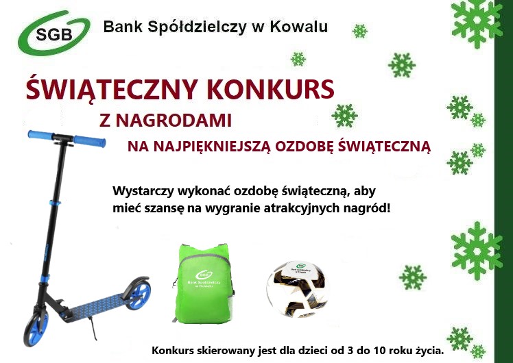 Wyniki konkursu zostaną ogłoszone 20.12.2022 r. na profilu Banku Spółdzielczego w Kowalu na Facebooku.