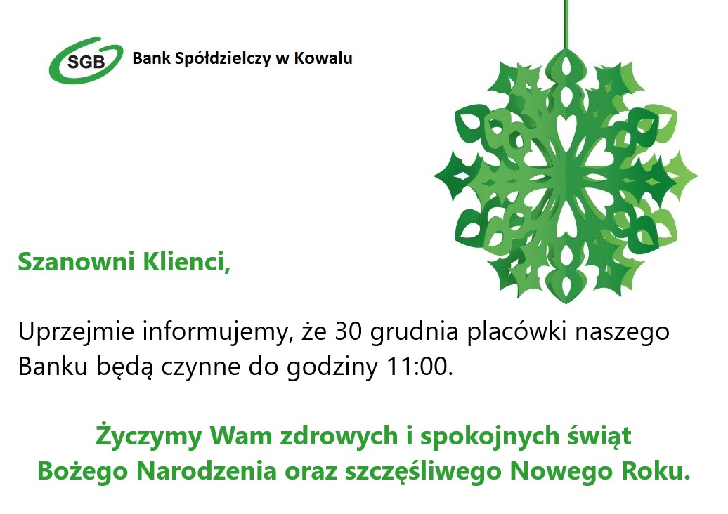 Uprzejmie informujemy, że 30 grudnia placówki naszego Banku będą czynne do godziny 11:00.